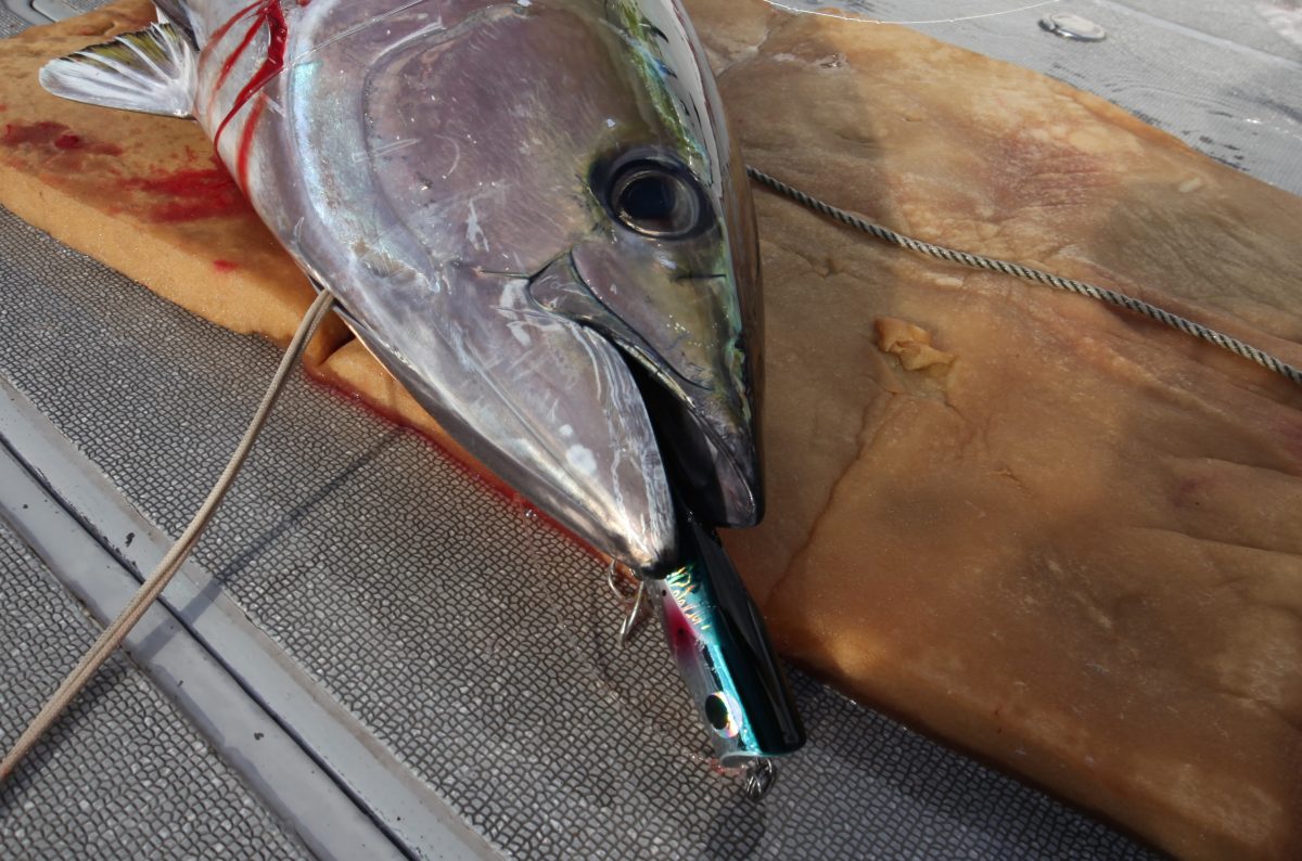 前日はお昼頃にも時合いがあったと船長がいうなか、キャスティングでサーチポップの誘い出しにヒット。それほど大型ではないが慎重にファイトし、30kgオーバーのキハダをキャッチ出来た。初日からキャッチ出来、ここ数回ノーキャッチだったので肩の荷が下りた感じであった。