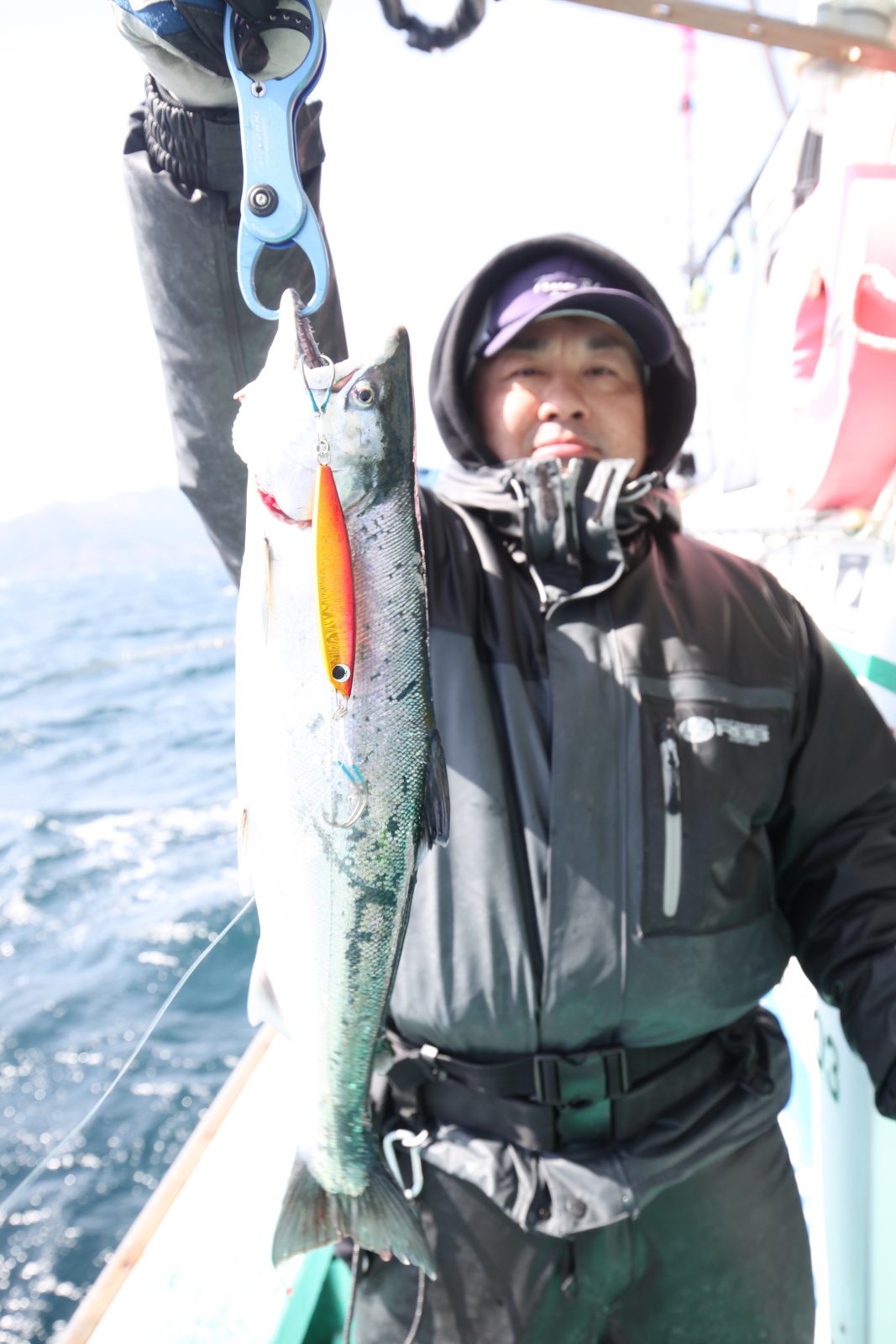 最初のポイントに到着し、その日のファーストヒットはなんと私にヒット。しかし前日にラインが傷んでいたのか、ファーストランでラインブレイク。サクラマスは群れでいることが多いため、周りのアングラーはヒットのラッシュ。私もすぐに別タックルに持ち替え2度目のタナを取り、フォール中にヒットしてキャッチ、事なきを得た。ジグはサーチメタルSRの100gだった。
