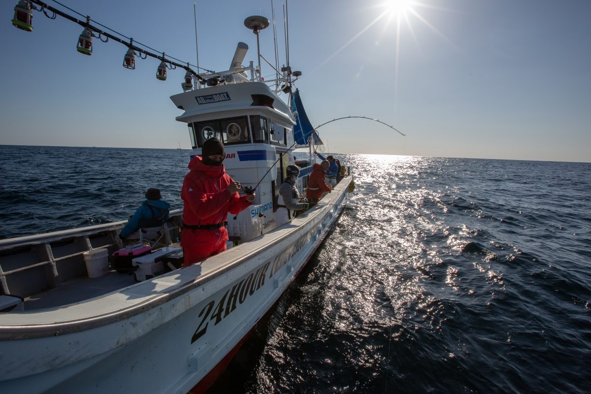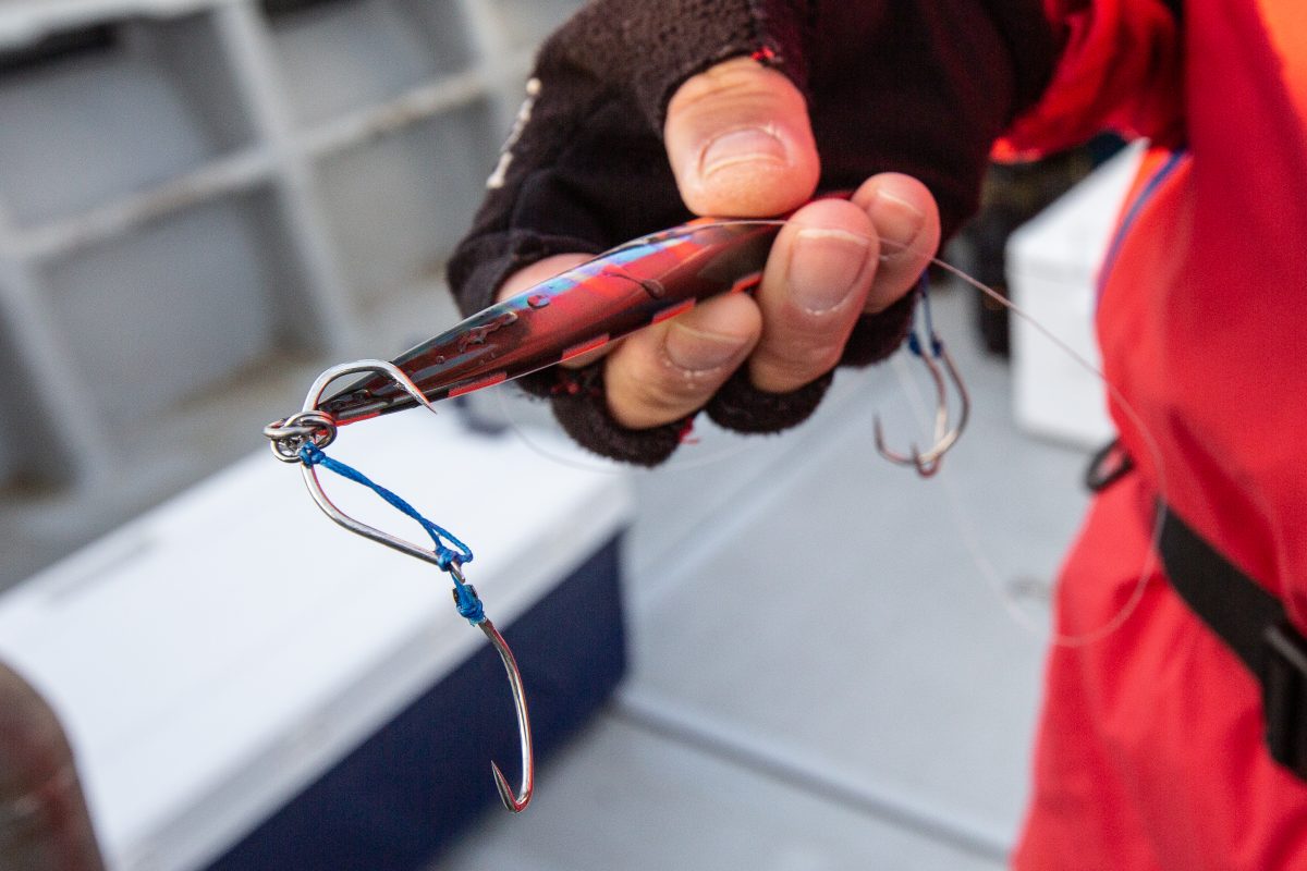 「ジグをしっかり動かすことが大切」とは、西本が繰り返し口にしていた言葉だ。ジグをしっかり動かすことは、ヒットまで至らなくともサクラマスを寄せることにつながる。つまり集魚効果が期待できる。根につくのではなく、ベイトを追って捕食回遊しているサクラマスの群れを、「ジグが発する光や音」により、まずは船下周辺に止めることが大切だ。水中に入っているジグの数が多いほうが、この足止め効果は高い。一定時間、足を止めたサクラマスの群れに対し、その日そのときにベストなジグやジグの動きでヒットに持ち込む、というイメージで釣っていく。