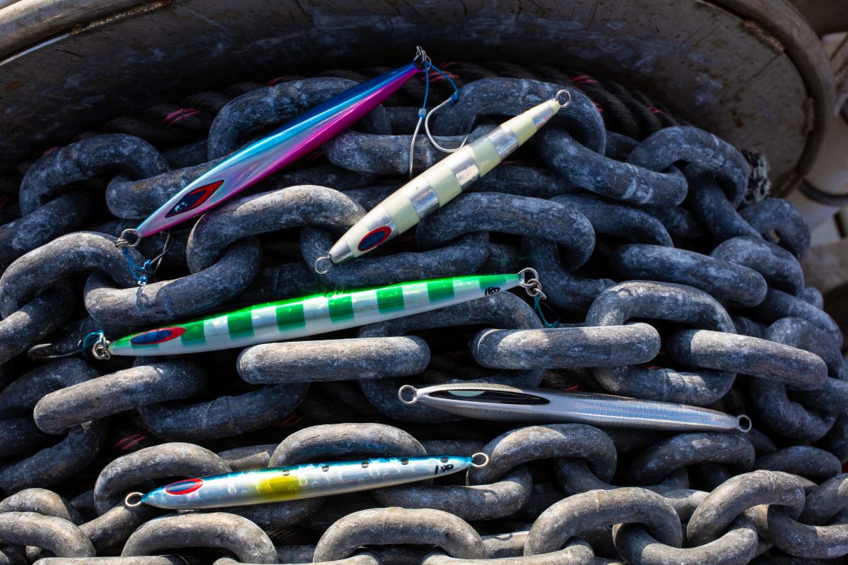 ジグは3つのメインパターンに合わせ、意識的に使い分けていくことが多い。使用するのはディープライナー製が中心だ。基本となるジグはSPY-V。これはいずれのアクションパターンでも多用する。ベースとなる「強めのジャーク&短めのフォール」では、ほぼSPY-Vで対応可能だ。「大人しめのジャーク&長めのフォール」ではSPY- Narrowを、「ジャーク&ジャーク」ではスピンドルNarrowを使うことも多い。イサダを偏食し、ヒラヒラ舞うようなアクションを狙うときには、スピンドルNarrow、スロースキップVB、FBを登場させることもある。