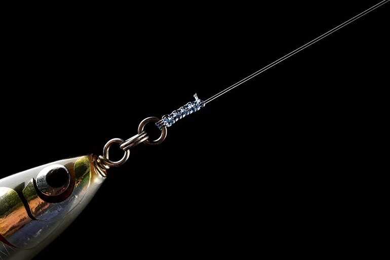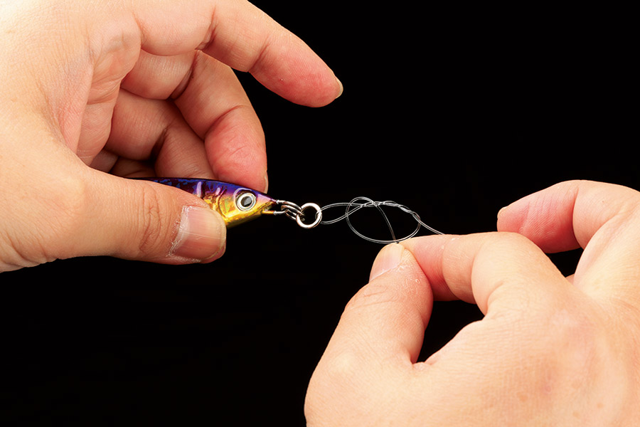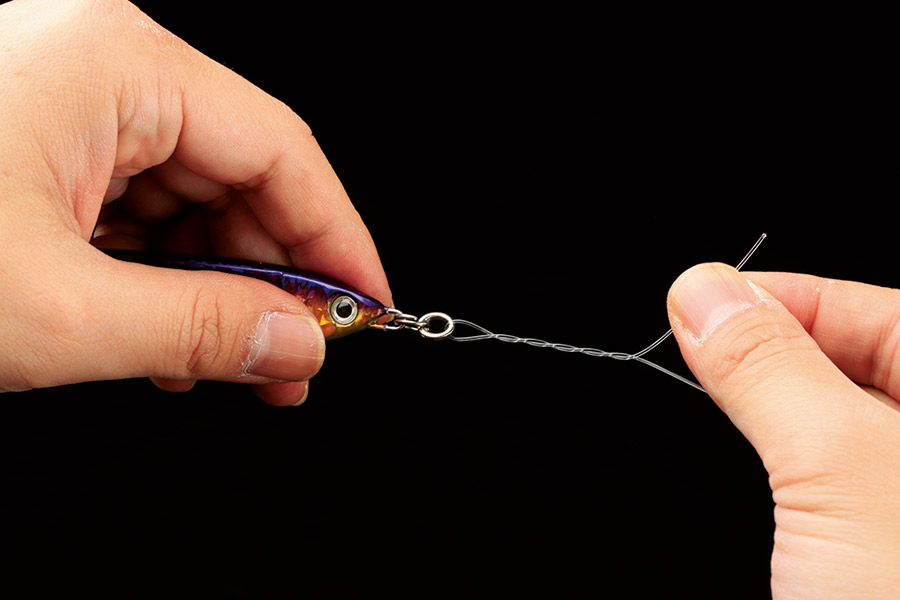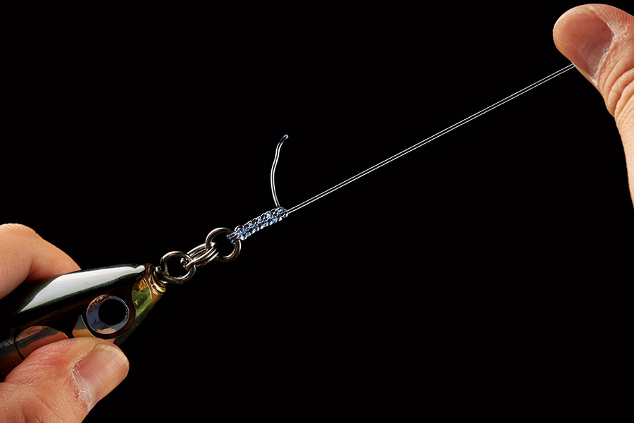 リーダーとルアーの結束時に強く結べることで、多くのエキスパートアングラーが採用しているノット。リーダーに編み込みを施すことで、より強い結束を実現。太いリーダーでもしっかりと結束できる。(写真はプラグに結んでいますが、結び方はジグでも同じです)