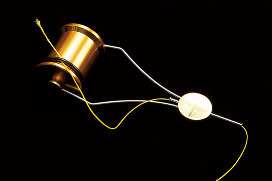 01 ホルダーにボビンをセットし、ホルダーの先端からPEラインを通し、ボビンのゴムに挟んで固定する。