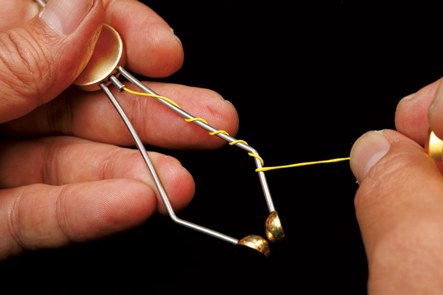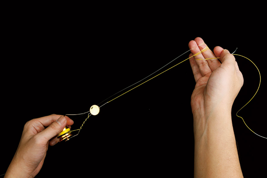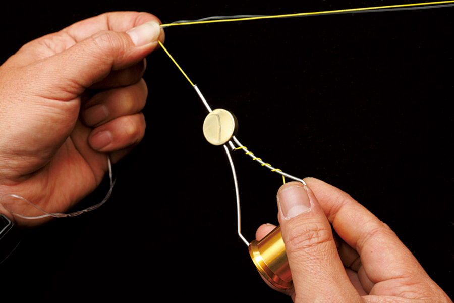 11 ボビンを外した部分のPEラインで、リーダーとPEラインを束ねるようにハーフヒッチで巻き止める。このとき回転させた方向と同一方向で巻き止めること。