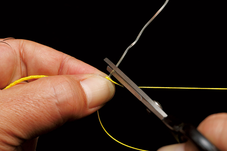 05 通したリーダーの先端が抜けないようしながら、ここまで作業した部分を唾などで湿らせ、ゆっくりと締め込む。しっかりと締め込まれたら、余分をカットして完成。