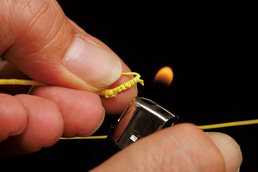 17 PEラインの残りを少し残してカットする。そのラインの残りをライターで炙る。メインラインに熱が伝わらないように注意すること。