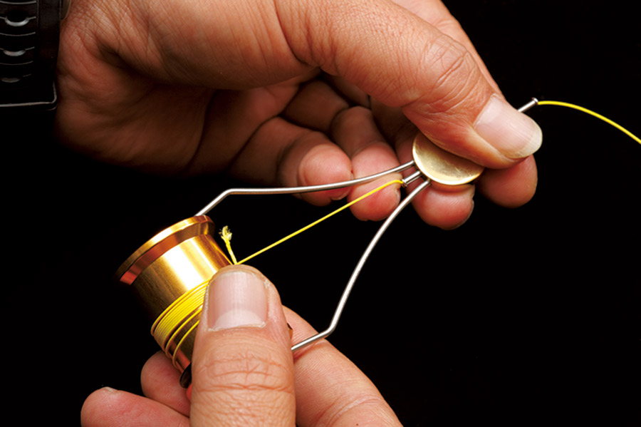 03 ボビンを外し、ホルダーのシャフトにラインを4 ~ 5回巻きつける。巻きつけることで、ライン放出の負荷が掛かるようになる。