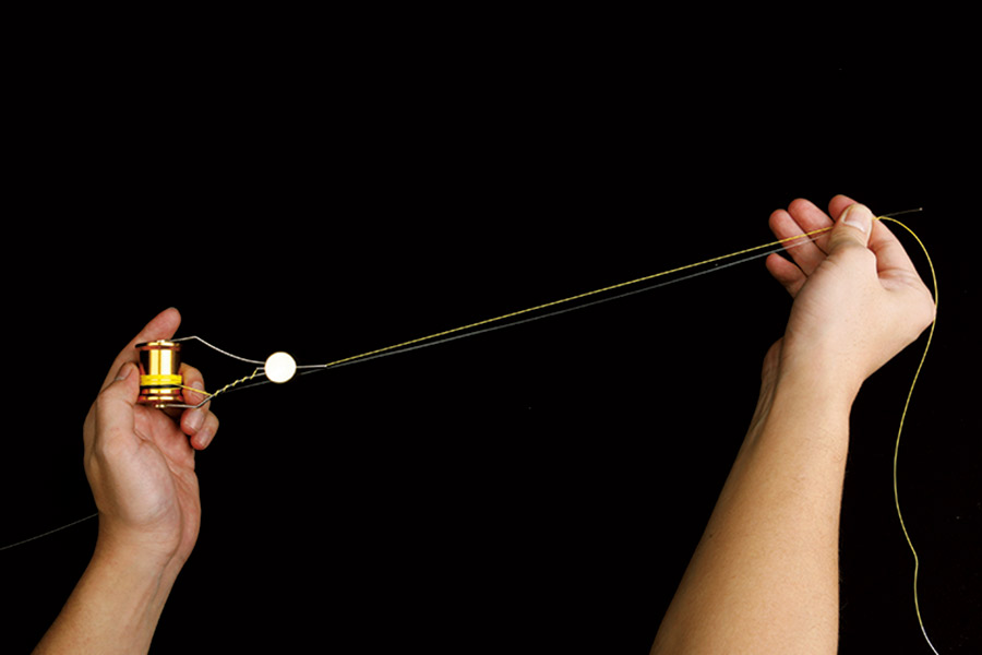 07 左側にボビンを回転させ4~5回巻きつける。6の右手の指があることで、右側には巻かれないようになる。