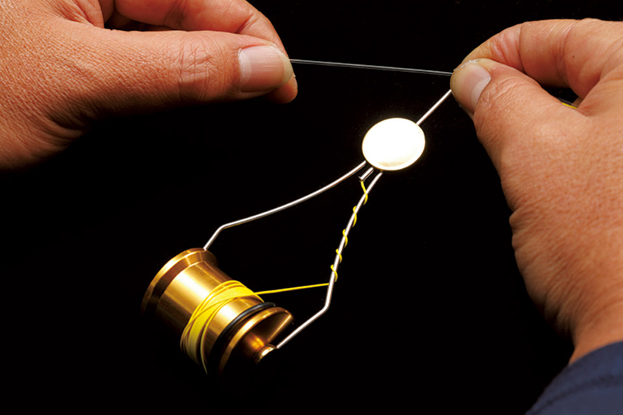 10 巻き終りを左手で保持しながら、右手に巻きつけ固定していたラインを外し、ボビンを引き抜く。ラインが長く残っている場合には、約30㎝残してカットする。
