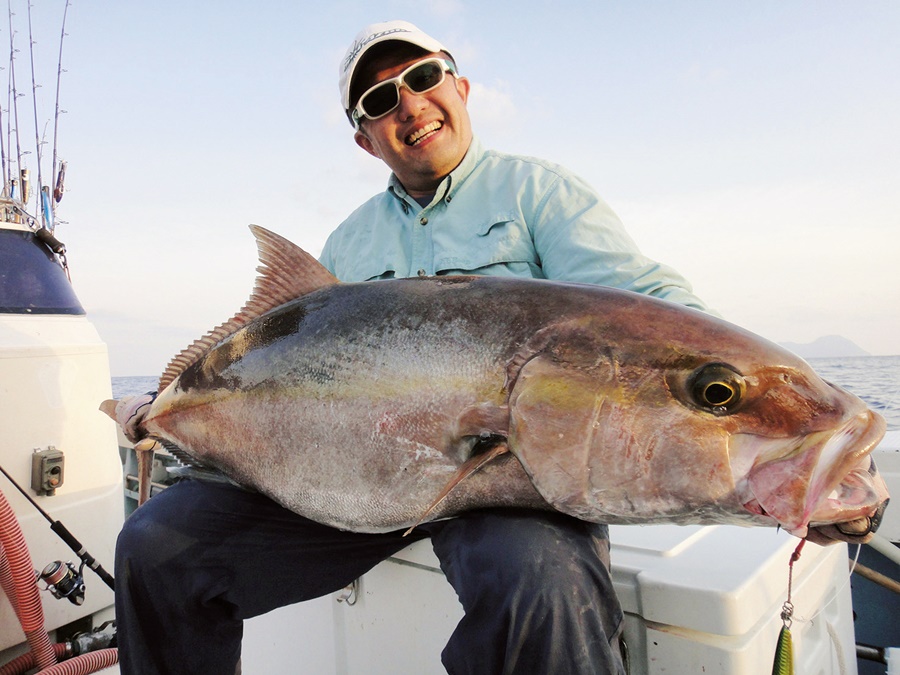 私が主力としているスピニングを使ったジギングでは、まずアピール力の強いロングジグを使用し、海底から大きく飛ばしながら誘い、時折ショートピッチに切り替えた瞬間にヒットすることが多い。カンパチ独特のトルクある強い引きが我々を楽しませてくれる。