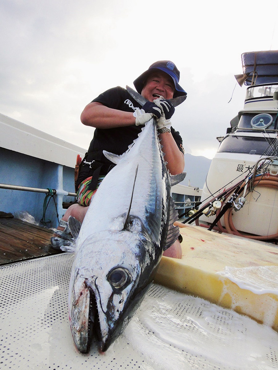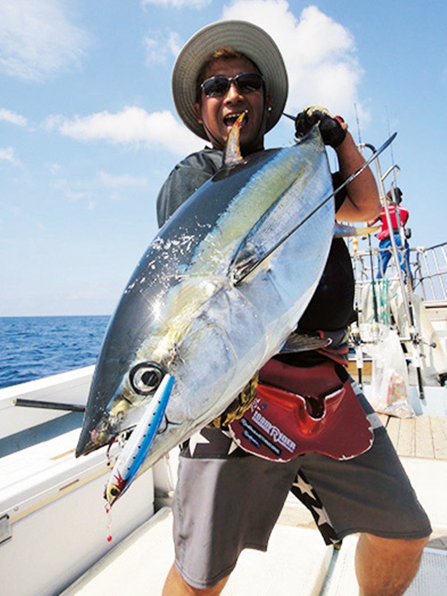 イソマグロも、基本はカンパチと同じアクションで誘う。水深1 0 0m前後の厳しい根周りを好み、10〜20㎏サイズのスクール(群れ)に当ると連続ヒットもある。