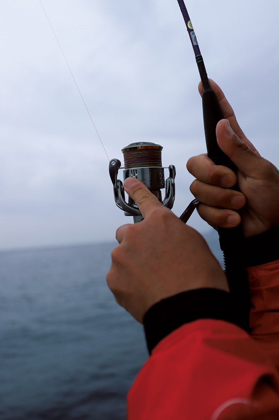 ▲人差し指でリールのスプールを押さえることで、より強いテンションを掛ける。魚が走ったら指を放し、止まるまで走らせる。スーパーライトジギングでは必須テクニックだ。