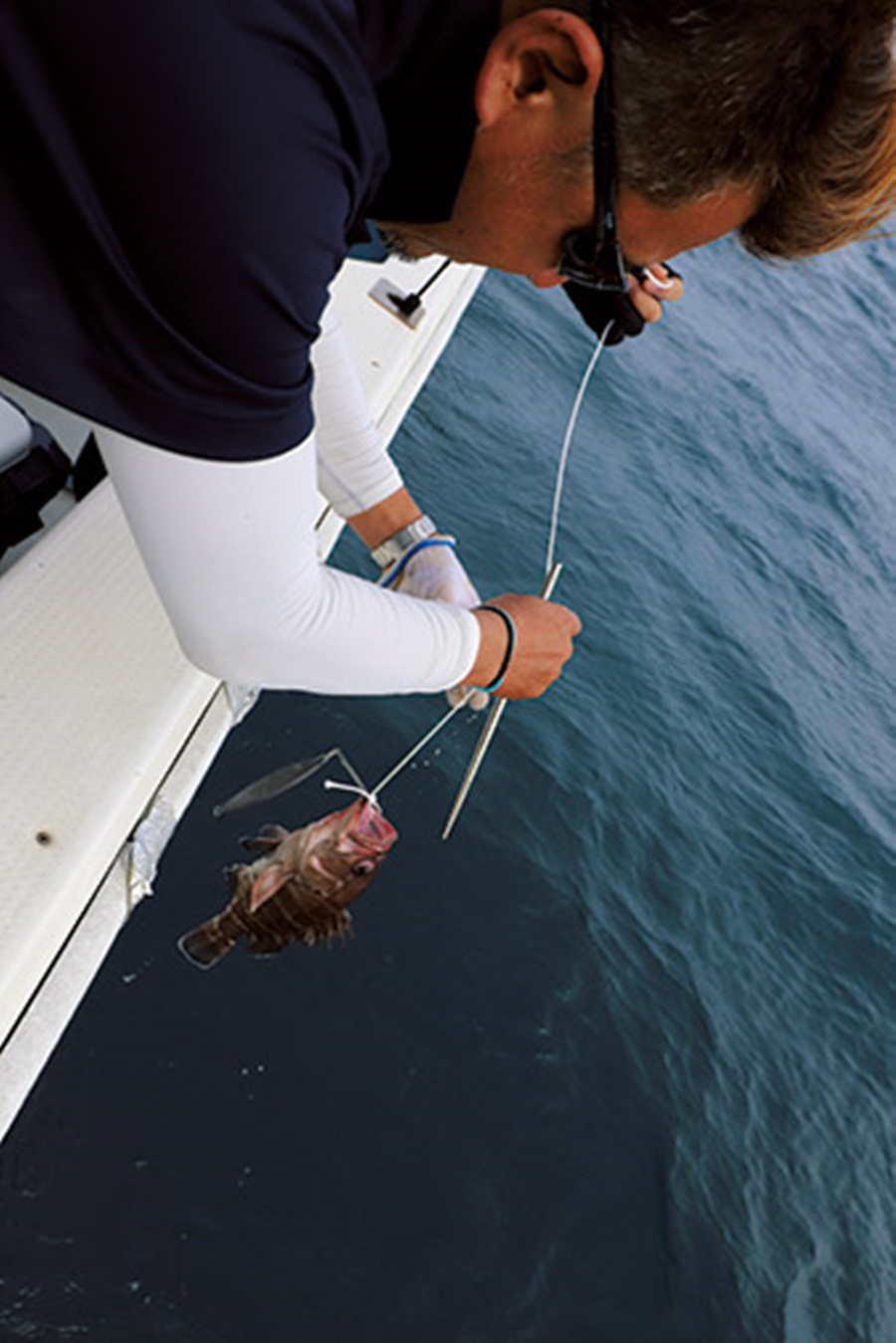 ▲喫水の浅い船では、フィッシュグリップなどを使って元気に泳いで行くまでサポートしてやることも有効だ。