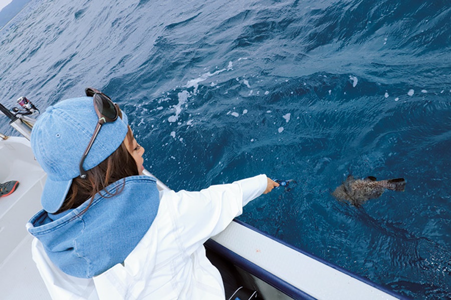 水深が浅いポイントを狙うことが多いスーパーライトジギング。だからこそ、ぜひ小型魚や不要な魚のリリースをお願いしたい。「浅い水深でヒットした魚は、手で触れたり船のデッキに置いたりせず、船縁でペンチリリースしてやれば、元気に海に帰っていきます。小さいジグを使うスーパーライトジギングでは小型魚も多くヒットします。ぜひご協力お願いいたします」と中村豪さん。末永くスーパーライトジギングを楽しむためにも、リリースに協力したい。