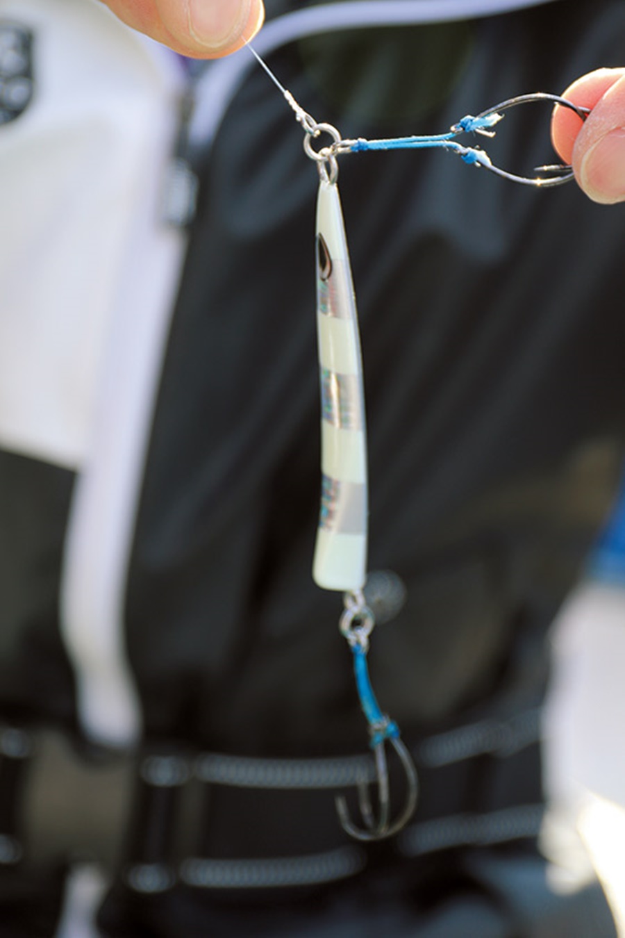 「リーダーの長さは1ヒロ(1・5m)です。一般的な考え方でいえば短いかもしれませんが、キャストすることを考えれば短いほうがトラブルが少なくなります。試しに1ヒロ以下で釣りをしてみたことがありますが、それでもヒット率に差は見られませんでした。また、スーパーライトジギングはゆっくりと誘う釣りなので、リーダーの長さは短くてOKです。極端なことを言えば、そのエリアの最大魚のサイズより長ければいいわけです。たとえばブリなら1mもあれば大丈夫です」