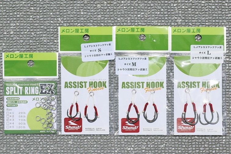 ▲スーパーライトジギング対応として市販されている出来合いのアシストフックやスプリットリングもある。写真はメロン屋工房のもの。手軽に楽しみたいアングラーにぜひオススメだ。
