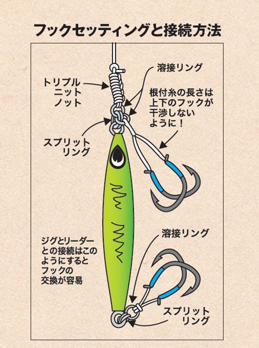 ▲リーダーとジグの接続は、小型の溶接リングとスプリットリング。スイベルやスナップは使用しない(イラストは大きめに描いています)。