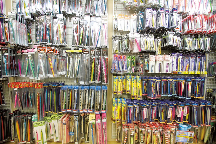 ▲釣具屋には様々な形状のジグが並んでいる。基本を知って、よりベストなものを選びたい。