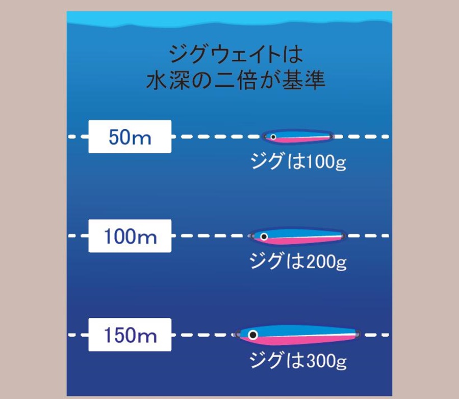 探る水深や潮の速さなどによって決まるウエイト。水深×2倍となることが多いが、海域の潮の速さや探り方、ベイトのサイズなどによっても変化する。訪れる船の船長に聞くのが、もっとも手っ取り早い。そのウエイトを基準に用意する。