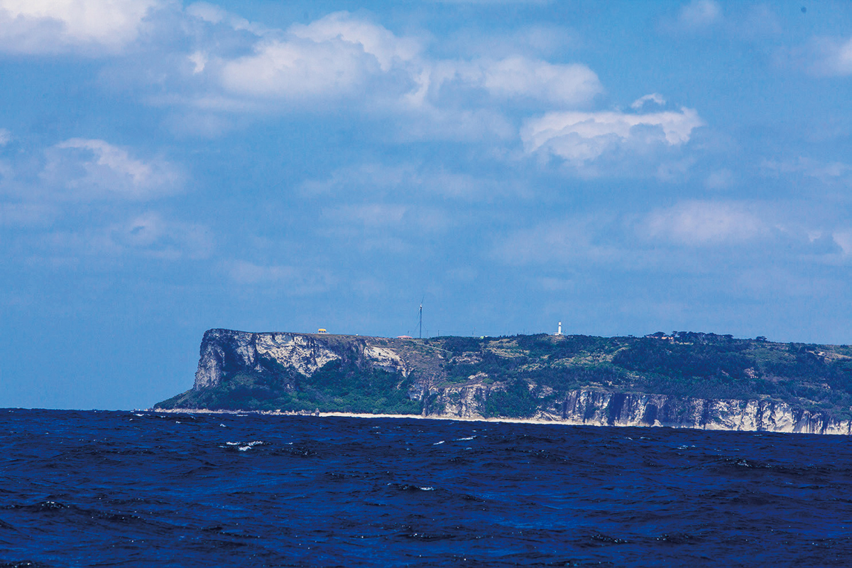 ▲周囲を断崖に囲まれた粟国島。「島の周辺はすべて中深海。そのなかに煙突のような島が存在する」イメージとは船長。「むるぶし」の得意とするフィールドのなかでも、最有望に位置付けられる遠征フィールドだ。