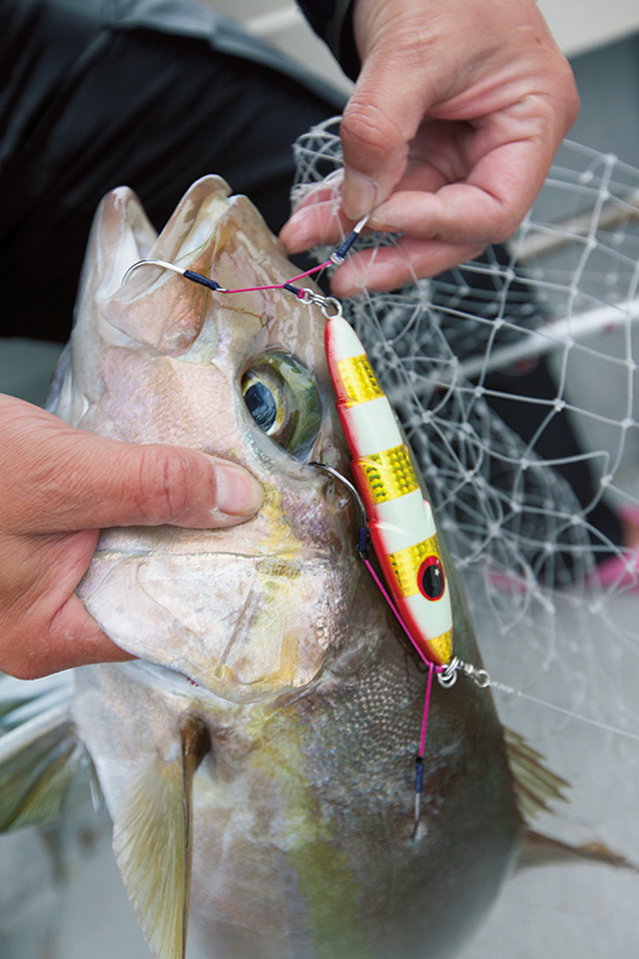 やり取りについては、スロージギングを前提にした場合、強引なポンピングは禁物だ。かえって魚を怒らせてしまい走られてしまう場合が多い、と宮平船長。ハンドドラグも活用しつつ【止める】⇒【横を向かせる】⇒【浮かせる】の順での、丁寧なファイトを勧めている。