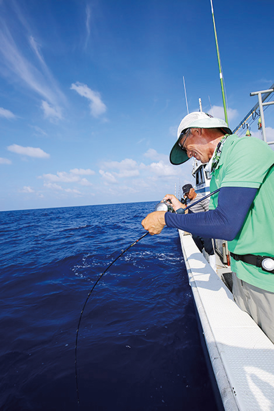 ▲通常のジギングにはなかなか反応しないパヤオ周りの魚に口を使わせるべくスローピッチジャークで開拓し、パヤオでのキハダ攻略のスタイルを確立させた西本康生氏。久米島ではビンチョウもよくヒットする。キハダより走らず、重い引きなのでそれと分かる。