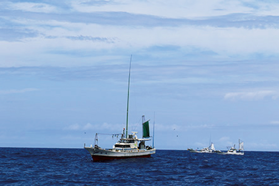 ▲通常のジギングにはなかなか反応しないパヤオ周りの魚に口を使わせるべくスローピッチジャークで開拓し、パヤオでのキハダ攻略のスタイルを確立させた西本康生氏。久米島ではビンチョウもよくヒットする。キハダより走らず、重い引きなのでそれと分かる。