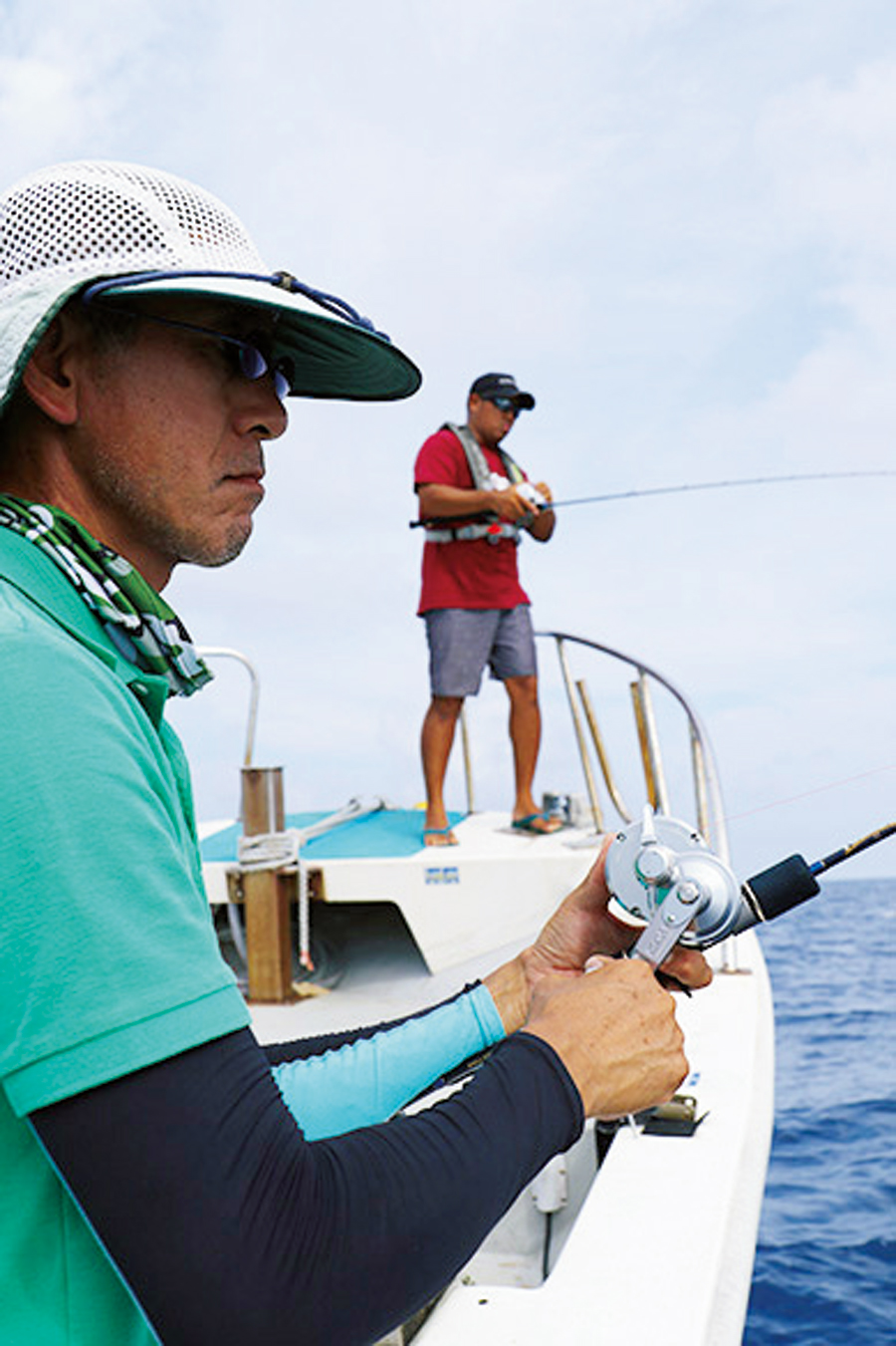 近年の久米島では、パヤオ周りで行われるエサ釣りのエサに学習したキハダ、回遊しながら目の前のエサを拾い食いするように捕食しているキハダをジグで攻略するために、スローピッチジャークも釣法をセレクトするアングラーが多い。