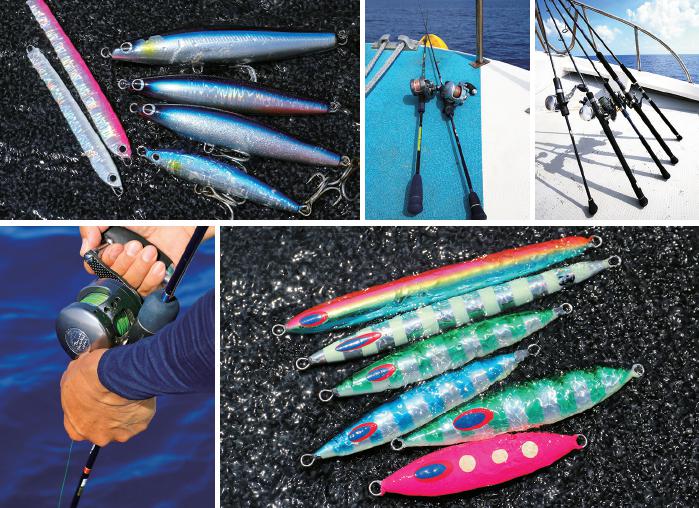 ▲タックルはジギング(スローピッチジャーク用、速いジャーク用)、キャスティングと用意したい。キャスティングのプラグはフローティングペンシルの他に、ポッパーも有効。ジグは150~300gがメイン。スローピッチジャークで狙う場合はリールが重要で、ボディやギアの剛性が高く、ドラグ性能の優れたものをセレクトしよう。ジグはフォールスピードの違いでセレクトする。