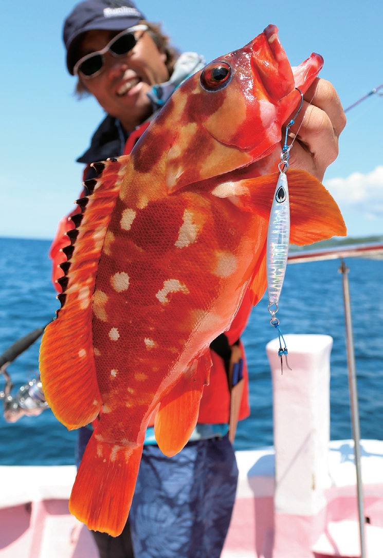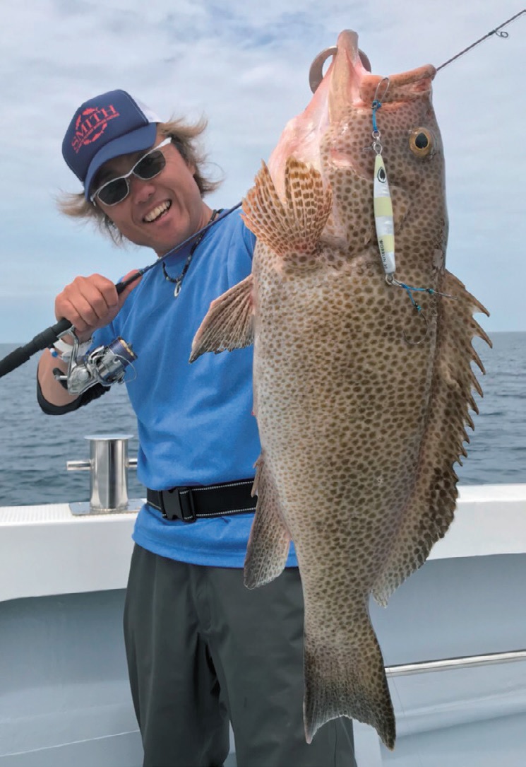 ▲ボトムを探れば根魚類がヒットしてくる。豊かな志摩沖はハタも多い。これはオオモンハタ。
