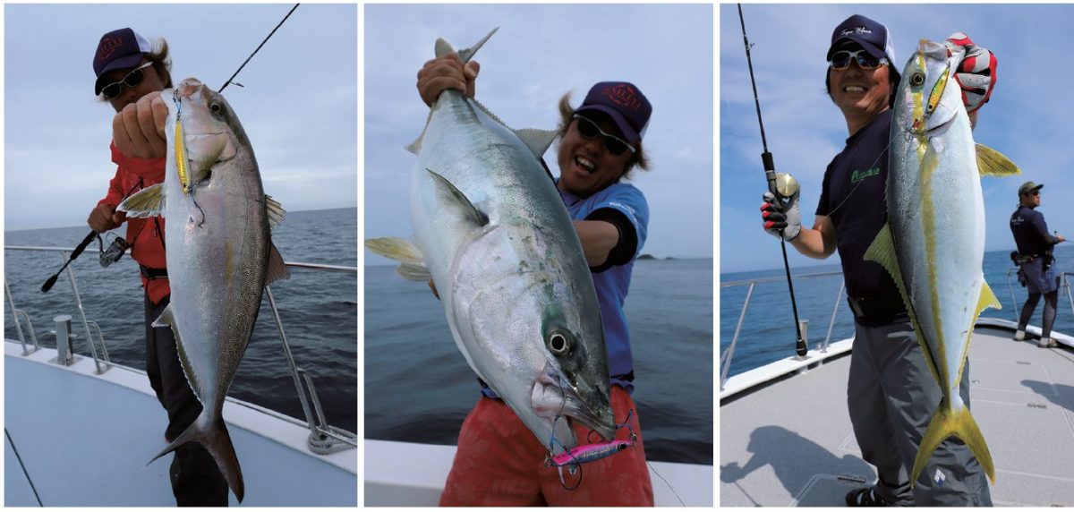 ▲イサキを狙って釣るためには、この青物たちのようなフィッシュイーターがキーワードとなる。右からヒラマサ、ワラサ、カンパチ。こんなサイズをスーパーライトタックルで上げるのだから、面白くないわけがない!
