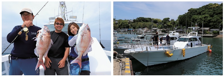 ▲講習会初日、進水したばかりの「勝吉丸」で講師を務めたのは、ビートの大貝俊也さんと、蒼井さやさん。真ん中は勝吉丸の吉村和也船長。この日、壱岐周りではマダイが好調だった。