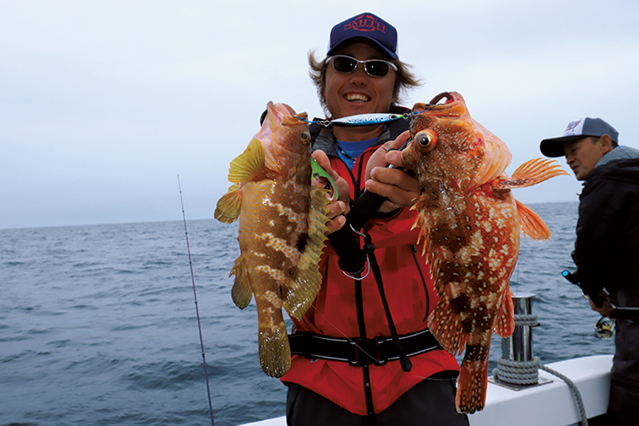 ▲ジグをボトムまで着ければ面白いように根魚がヒットする。カサゴとキジハタのダブルだ。