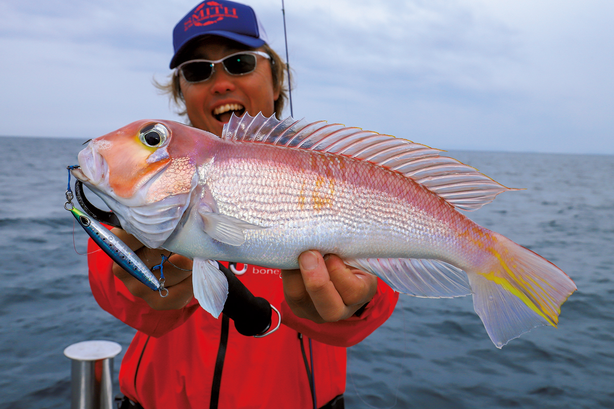 ▲レンコダイ(キダイ)、イトヨリ、フエダイの仲間。大貝さんが持つのはなんとシキシマハナダイ。こんな魚もジグにヒットする。そしてワニゴチ。