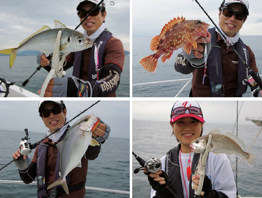 ▲右上から時計回りにカサゴ、イシモチ、シオ、マアジの順。このほかにツバス、シーバスもヒットした。ターゲットはまだまだ増えそうだ。