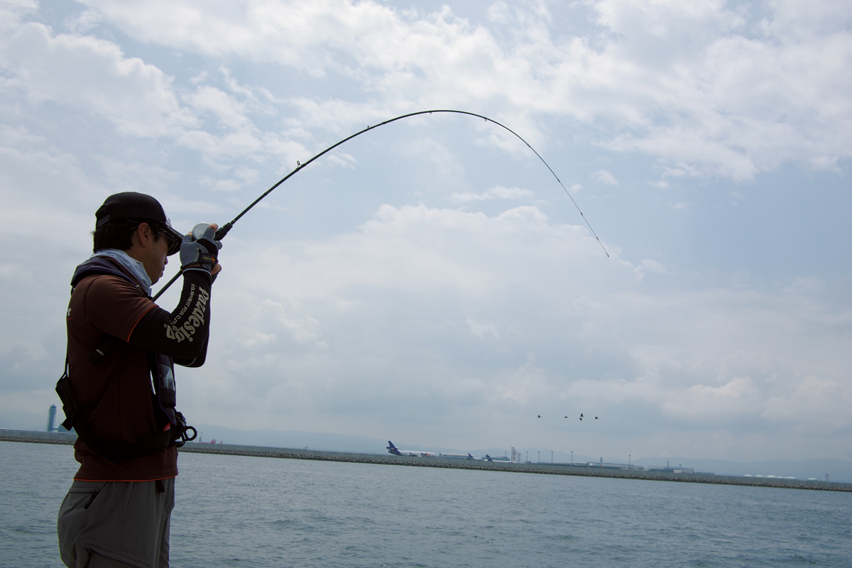 ▲関空の沖でシオ、ツバスなどのパワフルな引きを受け止める。マイクロジギングのロッドには繊細さだけでなく、いざというときの粘りやパワーも必要だ。