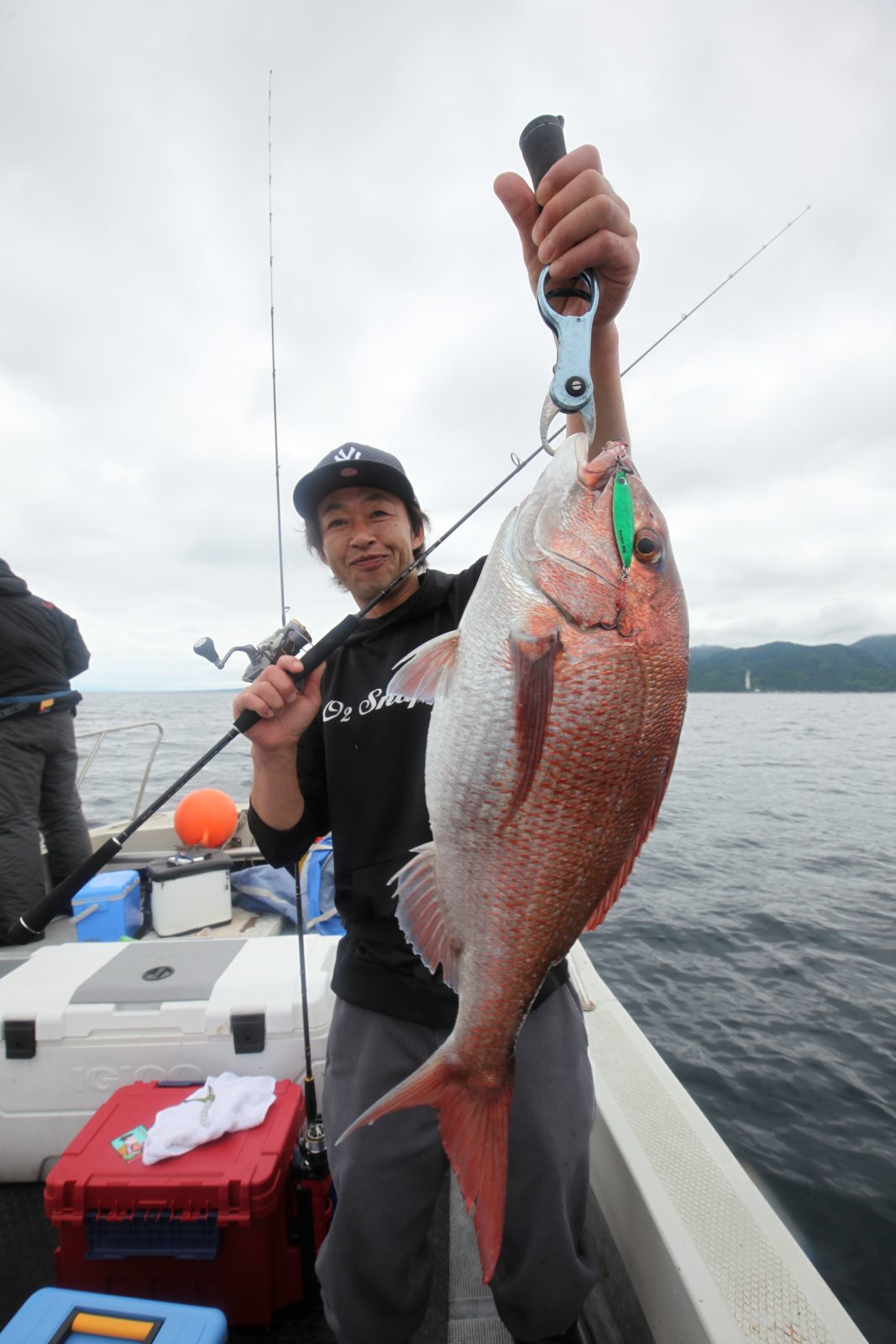 平舘港はポイントが港のすぐ沖にあり、船長が反応を見つけ実釣を開始すると、なんと数投でヒット。幸先よくグッドサイズのマダイをキャッチできた。ジグは春から引き続きテストしているトリッカースリムと試作ロッド67LSでキャッチ。