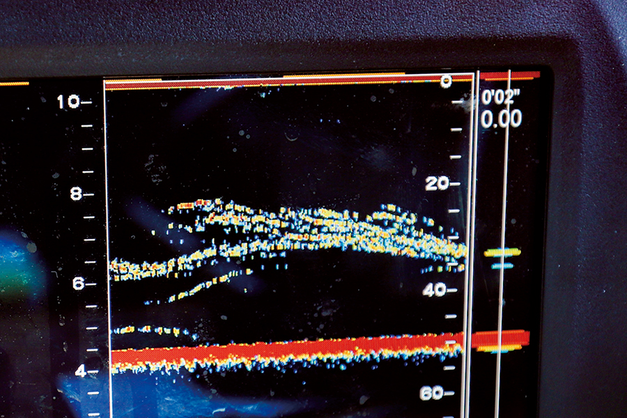 永井が言う〝中層の横の釣り〞を行うのは下の魚探画像のように魚の反応が中層に映し出されているとき。この画像では水深は50mで、中層20~40mに帯状に魚の反応が出ている。これがマダイだ。