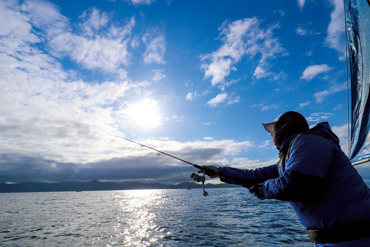 ▲中層に出た帯状の反応に効率よくジグをアピールするため、縦ではなく横方向の攻略がカギ。ジグをキャストし、中層へと送り届ける。