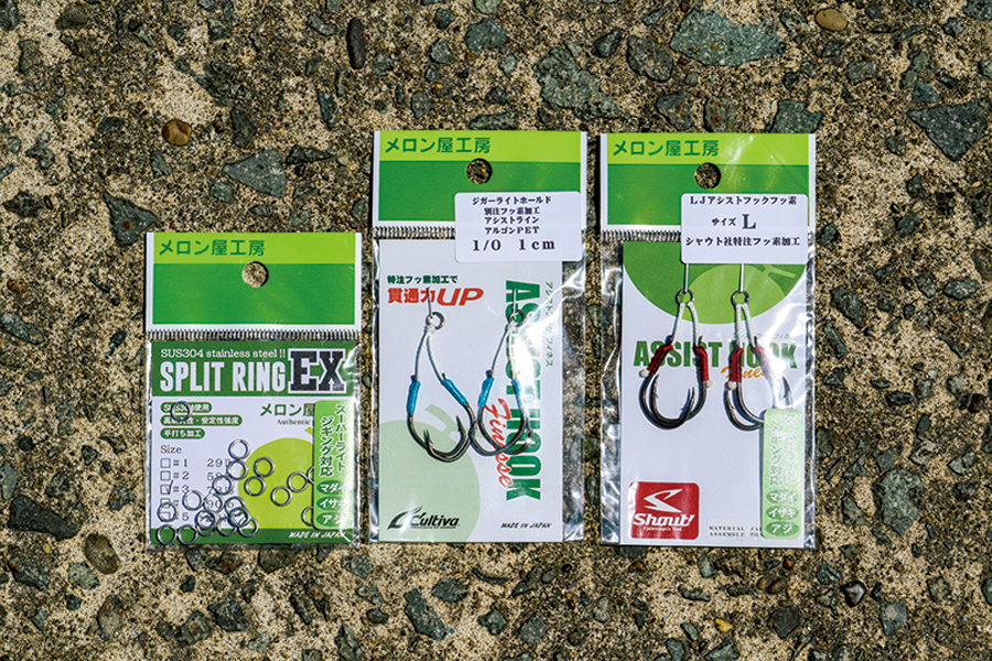フック:メロン屋工房・LJアシストフックフッ素加工M~Lサイズ、同シングルM~Lサイズ、ジガーライトホールド別注フッ素加工1/0