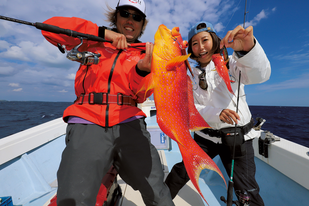 ターゲットは、この撮影が久米島でのスーパーライトジギングとしては初チャレンジであったため正確なことはいえないが、外洋ゆえ大型魚の確率も高いようで、撮影時にヒットしたのはメインが鮮やかな色彩のバラハタ。このバラハタは大変美味で、沖縄では高級魚として扱われる魚だ。ただ、シガテラ毒を持つ個体もいるので、食べる際は注意が必要である。ヒットしたバラハタはサイズもよく、スーパーライトロッドをグイグイ絞り込んで実に楽しそう。最高のターゲットであった。