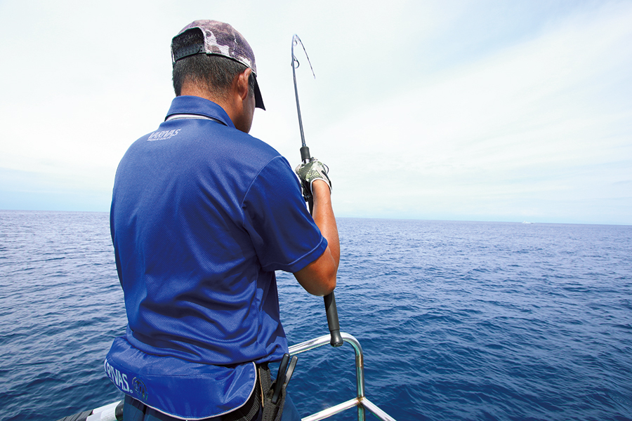▲キハダの泳層を読み、棚をしっかりと取ってしゃくり続ける横島さん。この日は、水深40m、30mほどが船長からの指示ダナだった。