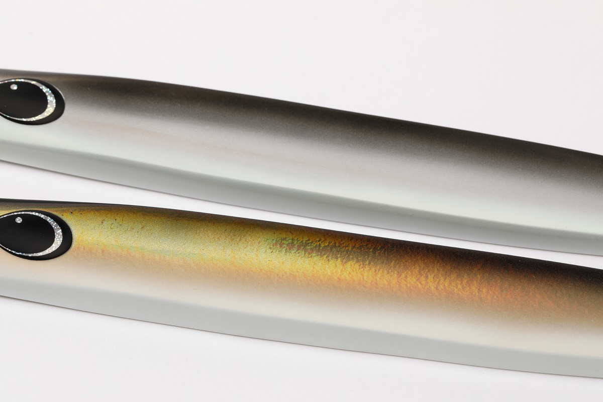 160g、130gモデルは、人気のサクラマスを攻略することをイメージしてサイズをセレクトしつつ、ベイトとなるオオナゴ(コウナゴの大型)やサンマをイメージしてカラーを依頼。しかし、ターゲットは無限大。実績はまだ得ていないが、オオナゴがいるエリアのブリや根魚にも効果を発揮しそうだし、ヒラマサにも良さそうだ。