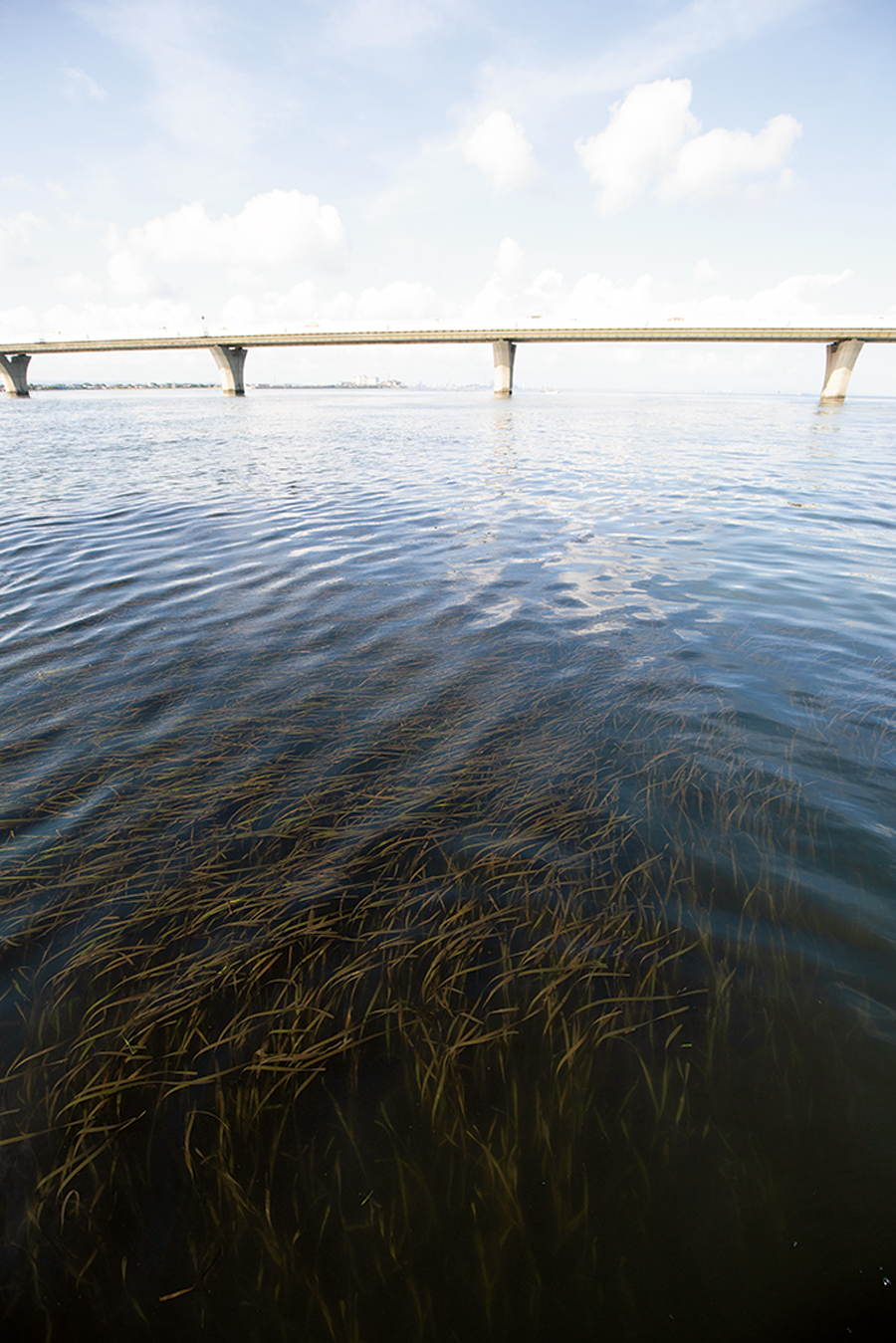 ▲水深は1m弱のポイントが中心。一見何も変化がないように見えるが、ボトムの地形変化や潮目、写真のようなアマモの周りが狙い目だ。