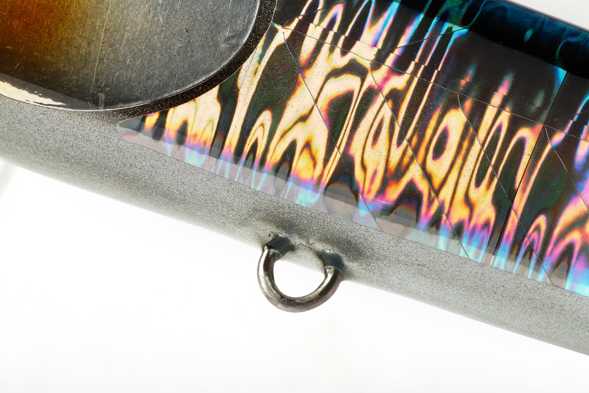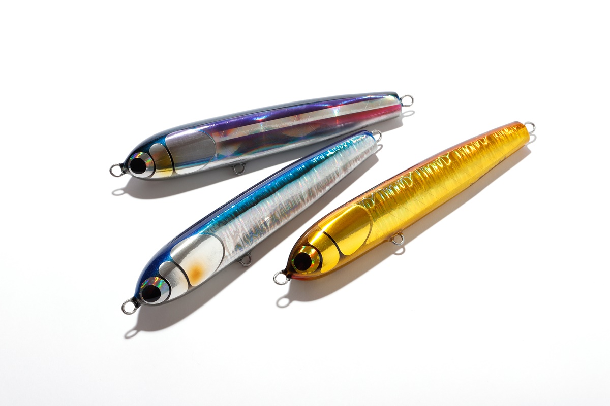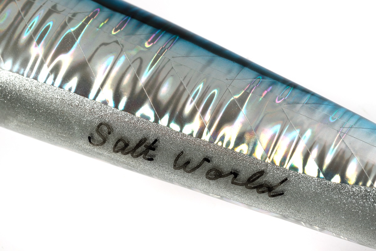 そんなプラグを、今回ソルトワールドオリジナルカラーに施して販売。側面のフラット面が広く、テール部を絞り込んだ独特のフォルムをし、これによりジャーキングでは水面下で左右に大きくダートさせることが可能。ただ巻きすると水面直下で曳き波を立てながらウォブリングアクションを演出。
