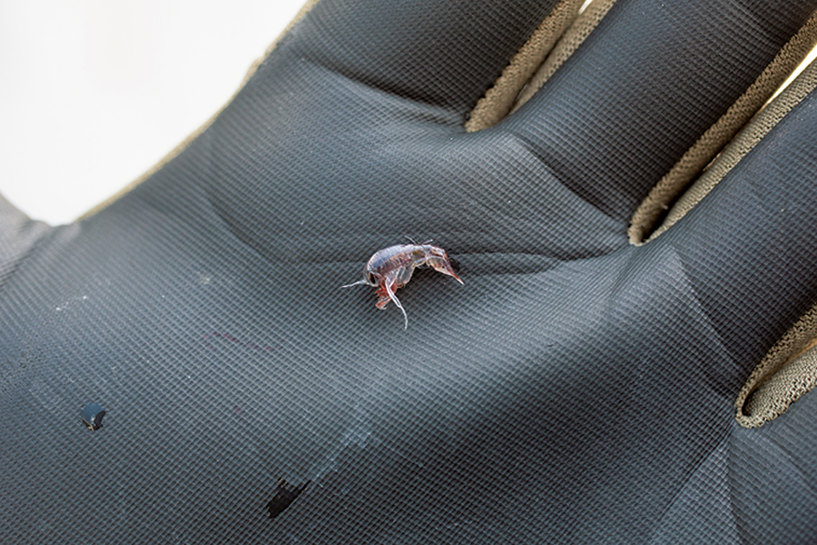 ▲釣りあげたサクラマスが吐き出したヨコエビ。表層付近でよく捕食されているベイト、とは西本。