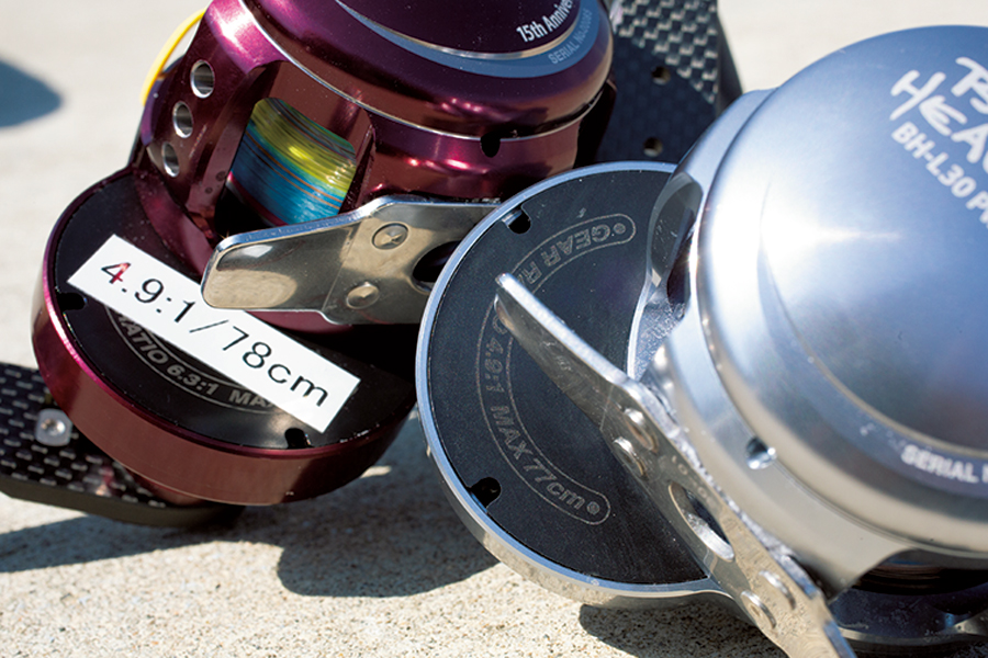 ▲リールはブルーヘブンL30Pwがメイン機となった。写真奥はハイギアモデルの内部ギアを乗せ換えたプロト機。最終的にハンドル一回転の巻き取り量は77cmとなった。