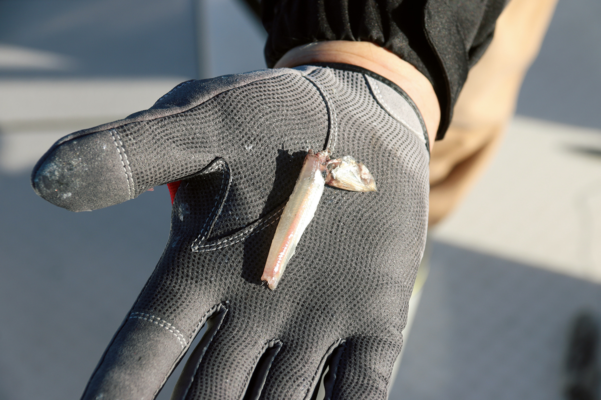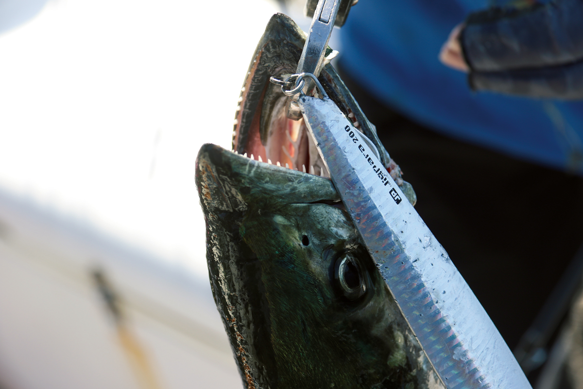 ▲同船者のメジャクラユーザー、柿原智彦さんがジグパラキビナゴカラーで釣ったサワラが吐き出したのは、まさにキビナゴだった。