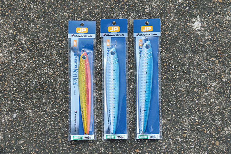 (写真右)ジグ:ジグパラバーチカル/ロッド:フルソリFSLJ-B64M/リール:オケアノス ワイドHD/ライン:弾丸ブレイドマルチタイプ1.5 号/リーダー:弾丸フロロ ショックリーダー30~40lb
