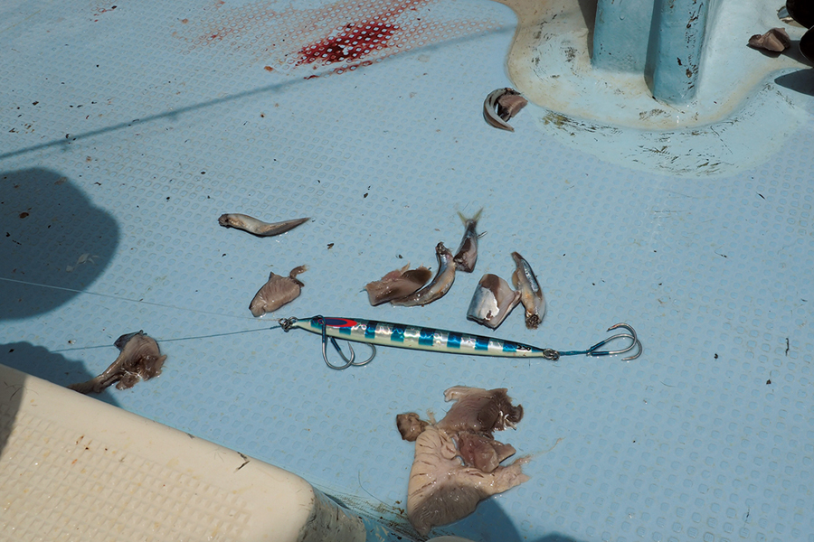 2つのロングジグにいまひとつ反応しないときは、ショートタイプでシルエットが小さいジグを試す。喰いが渋く、小さいエサばかりに反応しているように感じるときに投入する。エサ釣りの人と同船したときに感じることが多い、タナがきっちり決まっていると感じるときもキハダが口を使ってくれやすい、と西本。