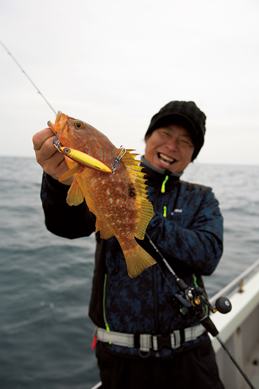 ▲底から離れにくいキジハタも、丹念なフォールアクションでキャッチ成功! 甲殻類を意識したアカキンカラーは定番だ。